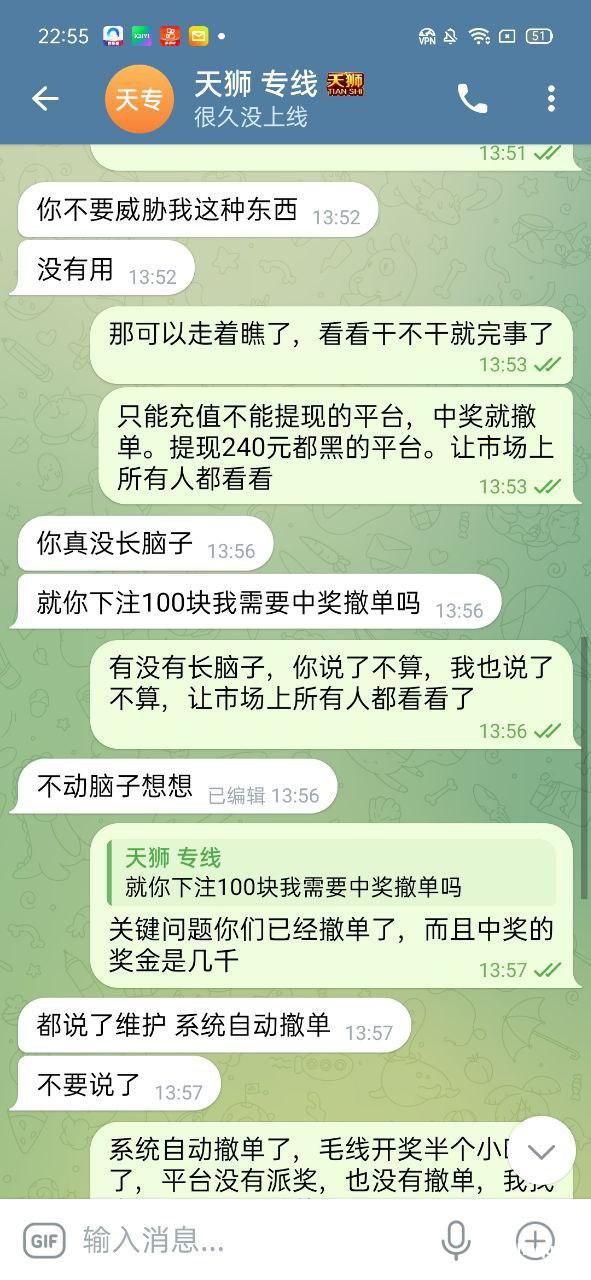 本人今年3月份在天狮娱乐打新澳门六合彩亏了8万,8月13号登陆平台账号有130块钱玩了一下平台的奇趣腾讯qq分分彩,买了三星复式单挑中奖了,差不多奖金九千多,平台直接给我撤单,找了专线和上级,专线和上级都说是碰巧维护,我投注的时候没有维护正常下注的。结果中奖了平台给我来了句,碰巧维护撤单处理,我要求平台给我奖金,不但不给反而把我账号给冻结了。大家记住天狮这个杀猪盘,只能输不能赢,中奖就撤单,而且冻结账号。希望有高层出来处理这个问题,黑了九千多块钱,如果没人才处理,就一直曝光,曝光到你们有人出来处理。