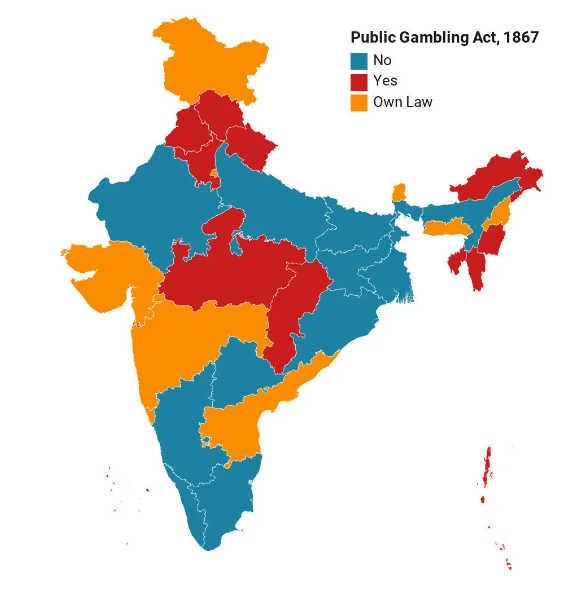 截至 2023 年底,随着移动智能手机在印度已逐渐攀升至 10 亿部以上,印度博彩业的市场规模已增长至 1700 亿美元。目前,印度有 14 个邦/州(在下图中标记为红色地区)遵循 1867 年颁布的《公众赌博法》允许在线和线下赌博活动的开展: