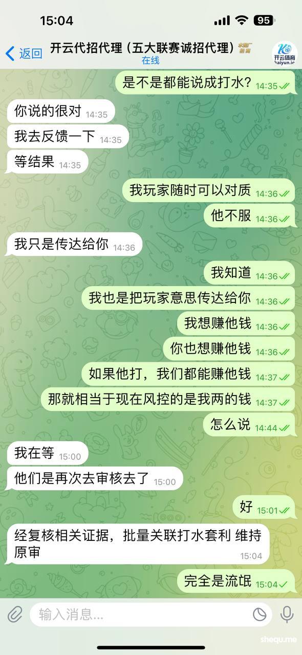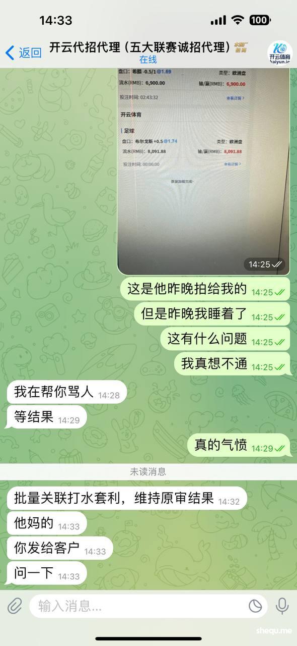 昨天我在开云平台开了一条线,拉了一个客户在开云黑平台玩,我客户充值第一次2500上去玩百家乐输了,然后第二笔充值8000块钱上去,玩了两场足球加百家乐,赢到32000出款,直接退本金,扣盈利。我去找招商记录,招商说我客户是打水,然后百家乐盖单,我把图发出来,大家评评理,谁他妈打水打0.7的水位,双边水位加起来没有2,怎么打水?还有说百家乐盖单,2000 4000盖单?如果我的玩家是打水,会百家乐2000 4000的打吗?打一单水才多少钱的利润?傻逼开云黑平台。