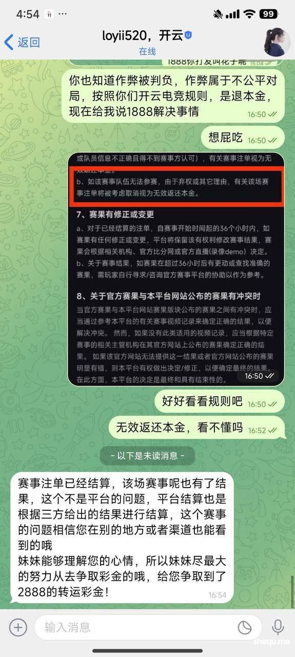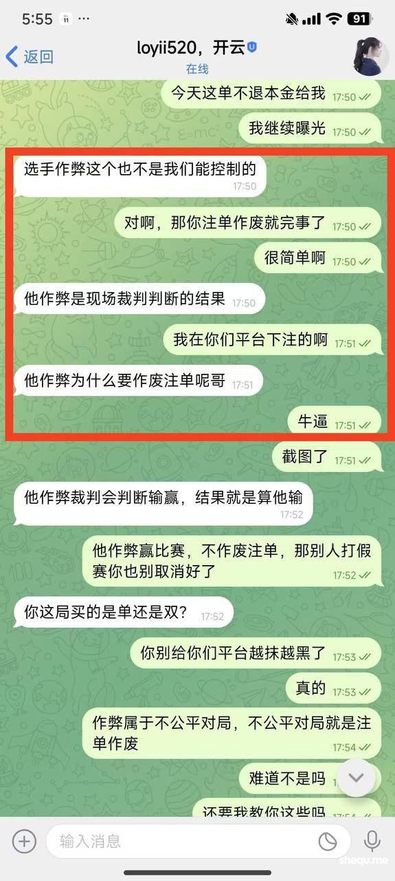 最好笑的是你们经理还给我说选手作弊了,为什么注单要作废,你们平台真是牛逼,会员投注违规就封号,选手作弊违规了就是正常的,按作弊比分来正常结算是吗