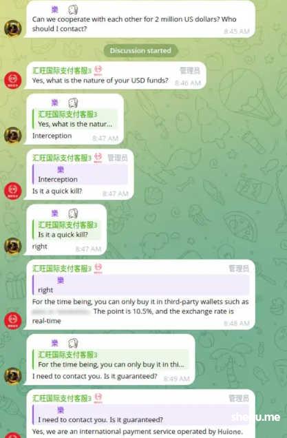一名汇旺担保用户请求帮助清洗200万美元的“速杀”(即一种诈骗)的所得资金。汇旺支付旗下汇旺国际支付的一名代表回应并澄清他们的服务是由汇旺运营的。