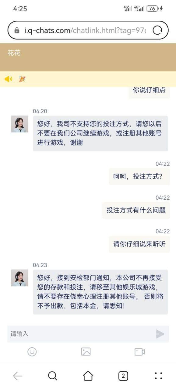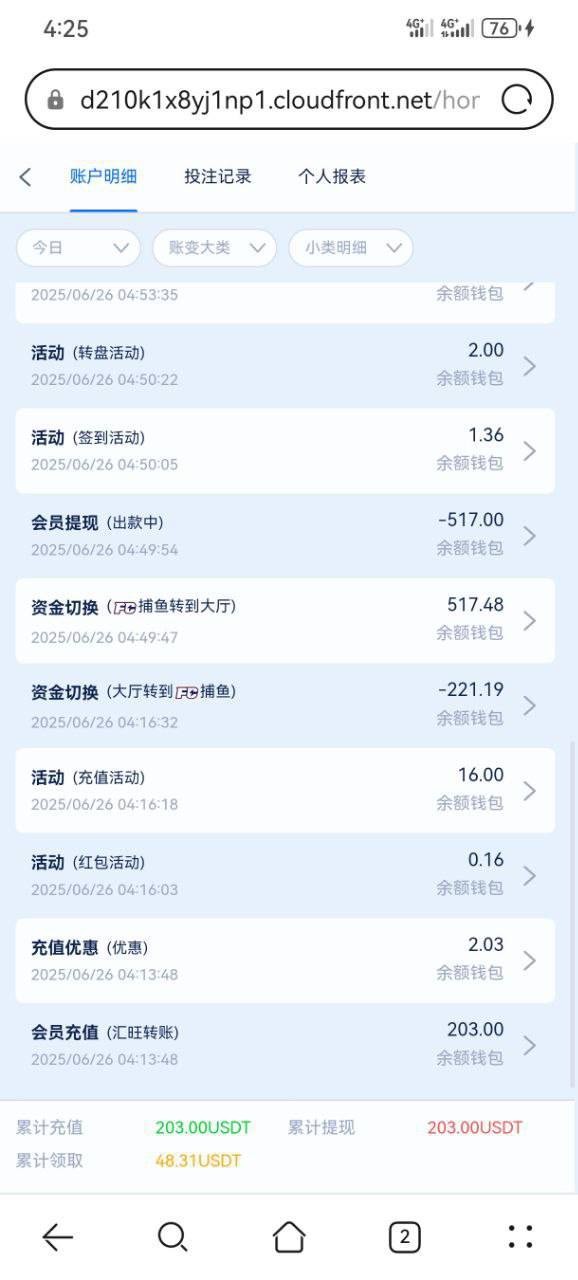 今天注册了一个账户,充值了200U,玩了一会儿捕鱼游戏,结果赢了,总共提了517U。等了半个小时还不到账,就去问客服。结果客服说我投注方式有问题,直接把我盈利部分扣掉了,只允许我提回200U本金。 呵呵,这种平台还有什么意思?赢了300U都不给你提那以后你们要是赢个几千、几万,会是什么下场,大家自己想想吧。