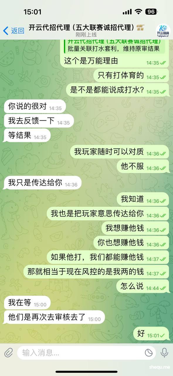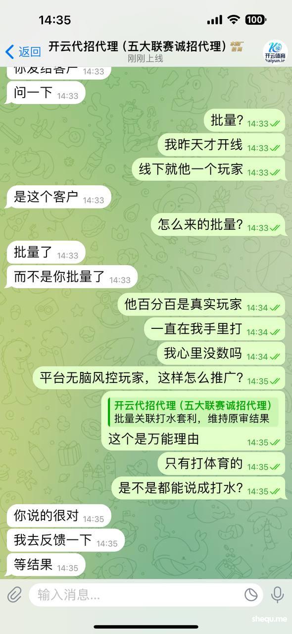 昨天我在开云平台开了一条线,拉了一个客户在开云黑平台玩,我客户充值第一次2500上去玩百家乐输了,然后第二笔充值8000块钱上去,玩了两场足球加百家乐,赢到32000出款,直接退本金,扣盈利。我去找招商记录,招商说我客户是打水,然后百家乐盖单,我把图发出来,大家评评理,谁他妈打水打0.7的水位,双边水位加起来没有2,怎么打水?还有说百家乐盖单,2000 4000盖单?如果我的玩家是打水,会百家乐2000 4000的打吗?打一单水才多少钱的利润?傻逼开云黑平台。