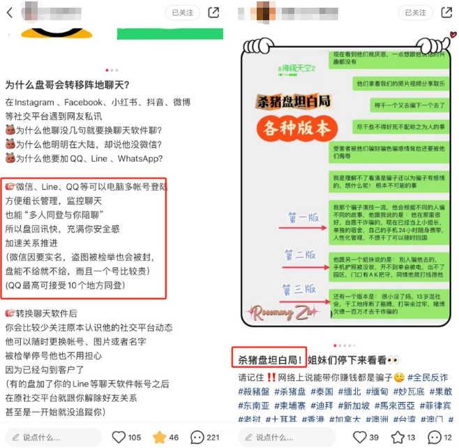 比如他们通常团伙作案,当盘哥发现碰到大户后,就会交给老鸟接着聊。盘哥的账号一般由多人同时登陆陪聊,既方便组长管理和监控聊天,也能做到时时事事有回应——这就是为什么盘哥回信息普遍比较快。如果上一个盘哥离开了园区,也总有人会继承他的手机、人设和客户。
