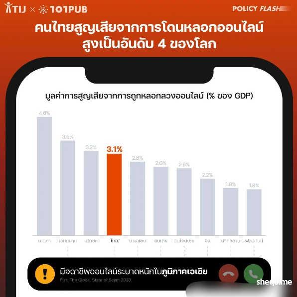 据悉,电信及网络诈骗被全球许多国家视为严重威胁,泰国也深受其害。据去年的数据显示,泰国因网络诈骗造成的财产损失位居全球第4位,占GDP比重的3.1%,具体排名如下:
